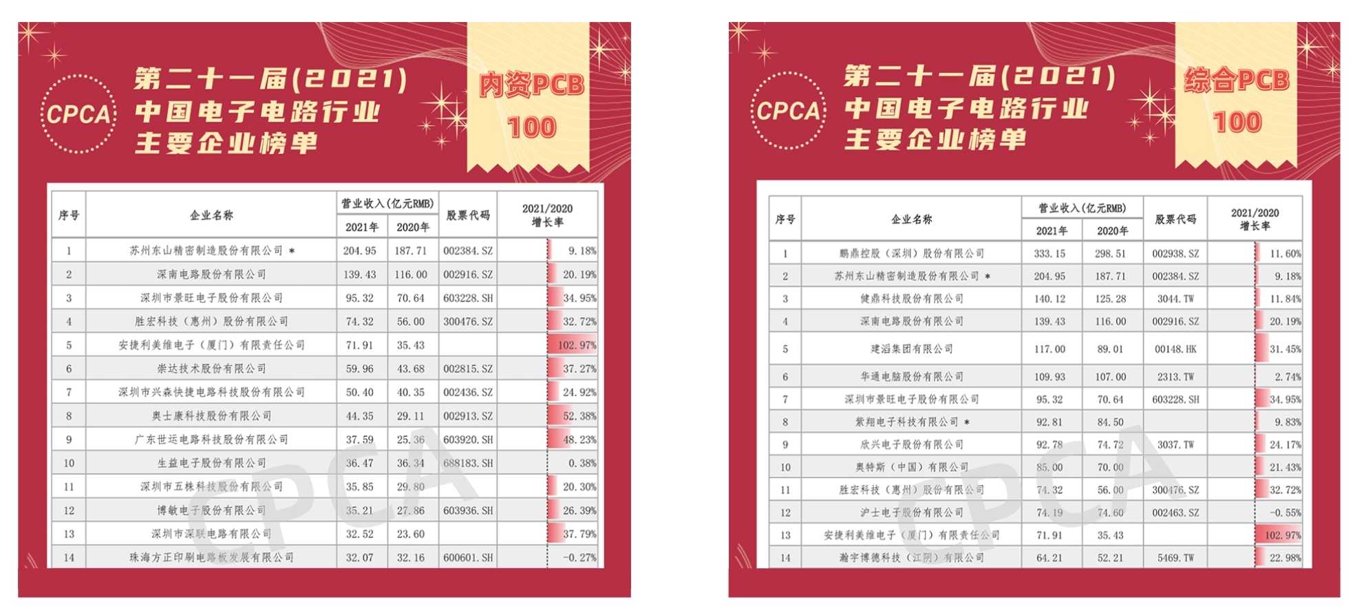 据悉,在此次发布的中国电子电路行业企业榜单中,入榜的136家PCB制造企业的总营收超3300亿元,较去年增长20%以上,PCB制造企业营收同比呈上涨态势。综合PCB百强榜单中内资企业数量达64家,营收合计增长26.8%,占综合PCB百强榜单收入的48.4%,较去年增加2.5个百分点。内资企业保持快速增长,对中国电子电路行业发展的贡献度进一步提升。