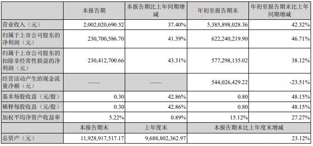 10月26日,我司公布2021年第三季度报告,1-9月公司主营收入53.86亿元,同比上升42.32%;归母净利润6.22亿元,同比上升46.71%;扣非净利润5.77亿元,同比上升38.12%;其中,2021年第三季度公司主营收入20.02亿元,同比上升37.4%;归母净利润2.31亿元,同比增长41.39%;归母扣非净利润2.30亿元,同比增长43.31%;基本每股收益0.30元。