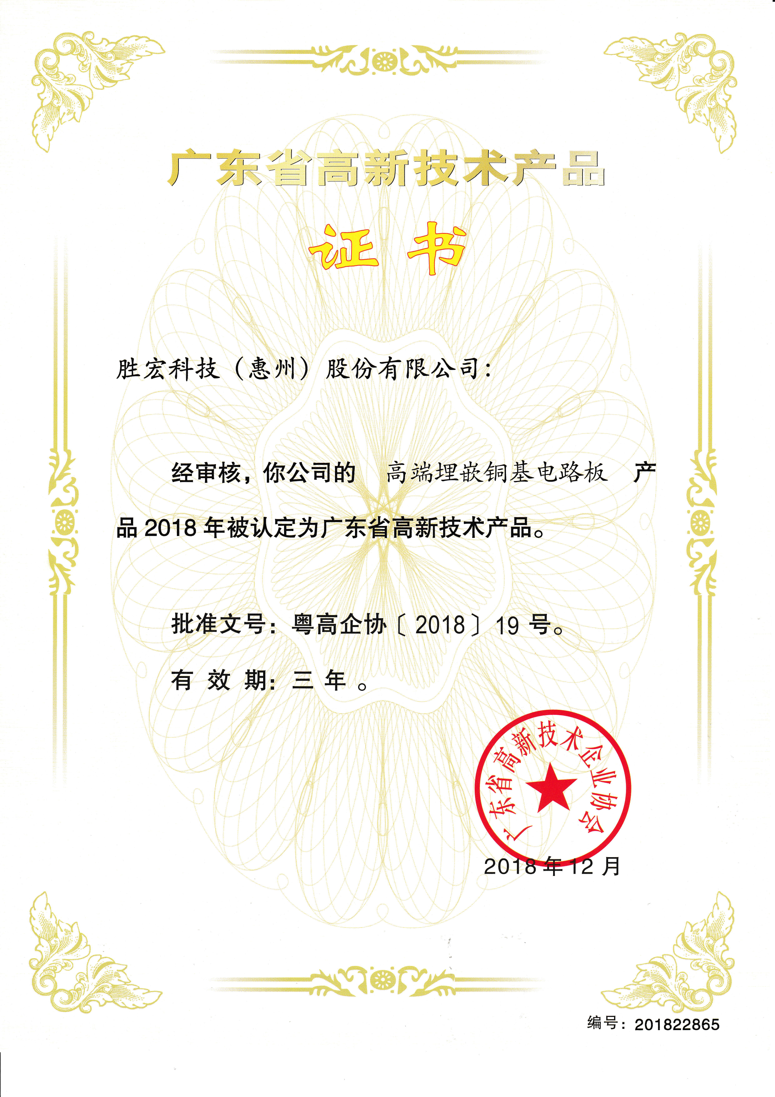 “高端高频电路板”高新技术产品证书